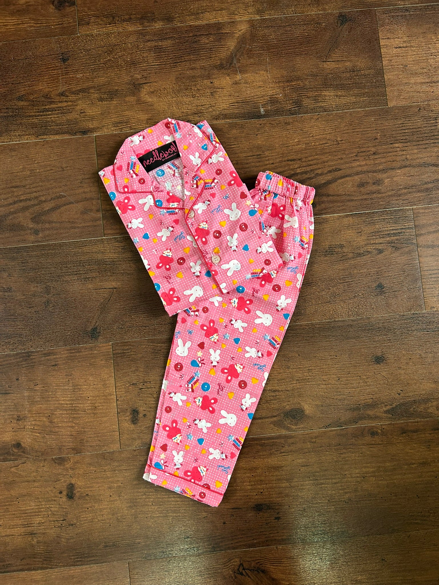 The Bunny Hop Night suit is a cheerful pink cotton set sprinkled with playful bunny and candy prints. Soft, breathable, and oh-so-comfy β itβs perfect for tiny dreamers to snuggle in.