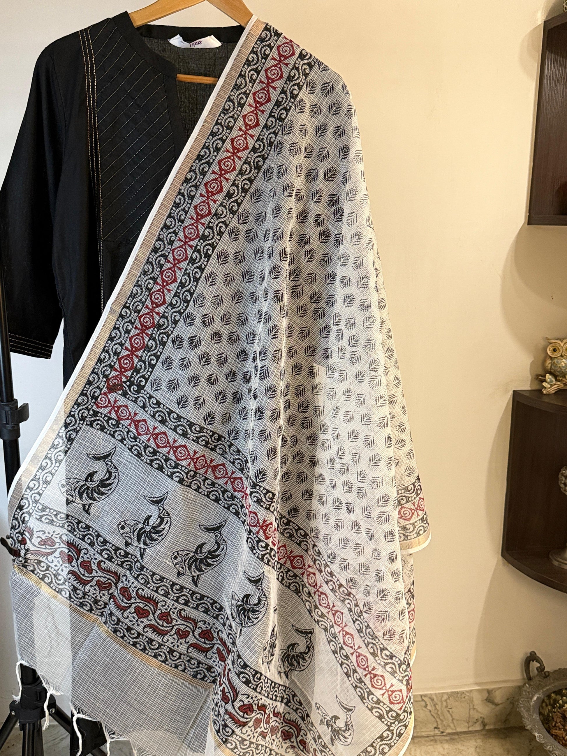 Matsya - White Kota Doria Dupatta with Fish Motifs