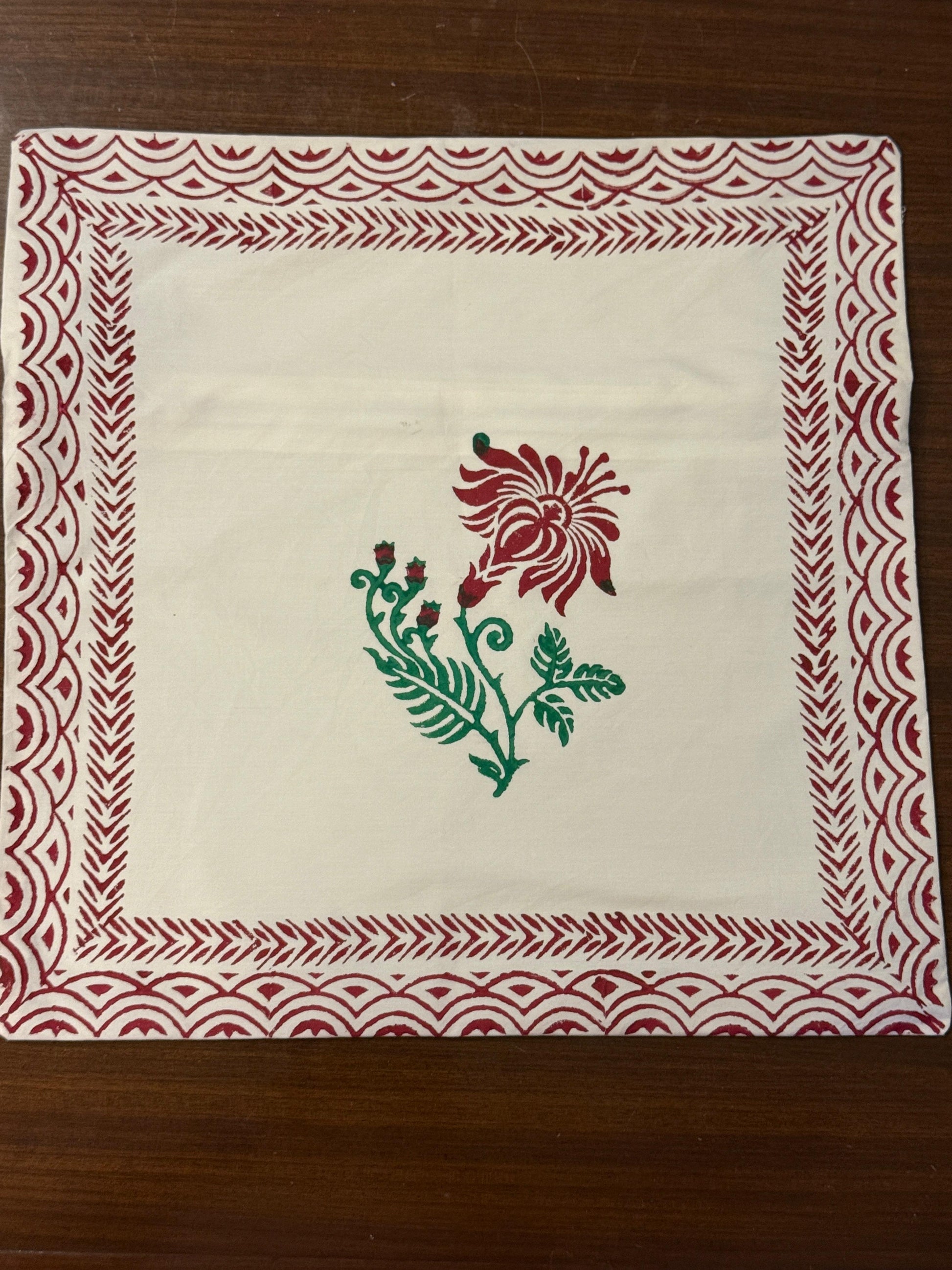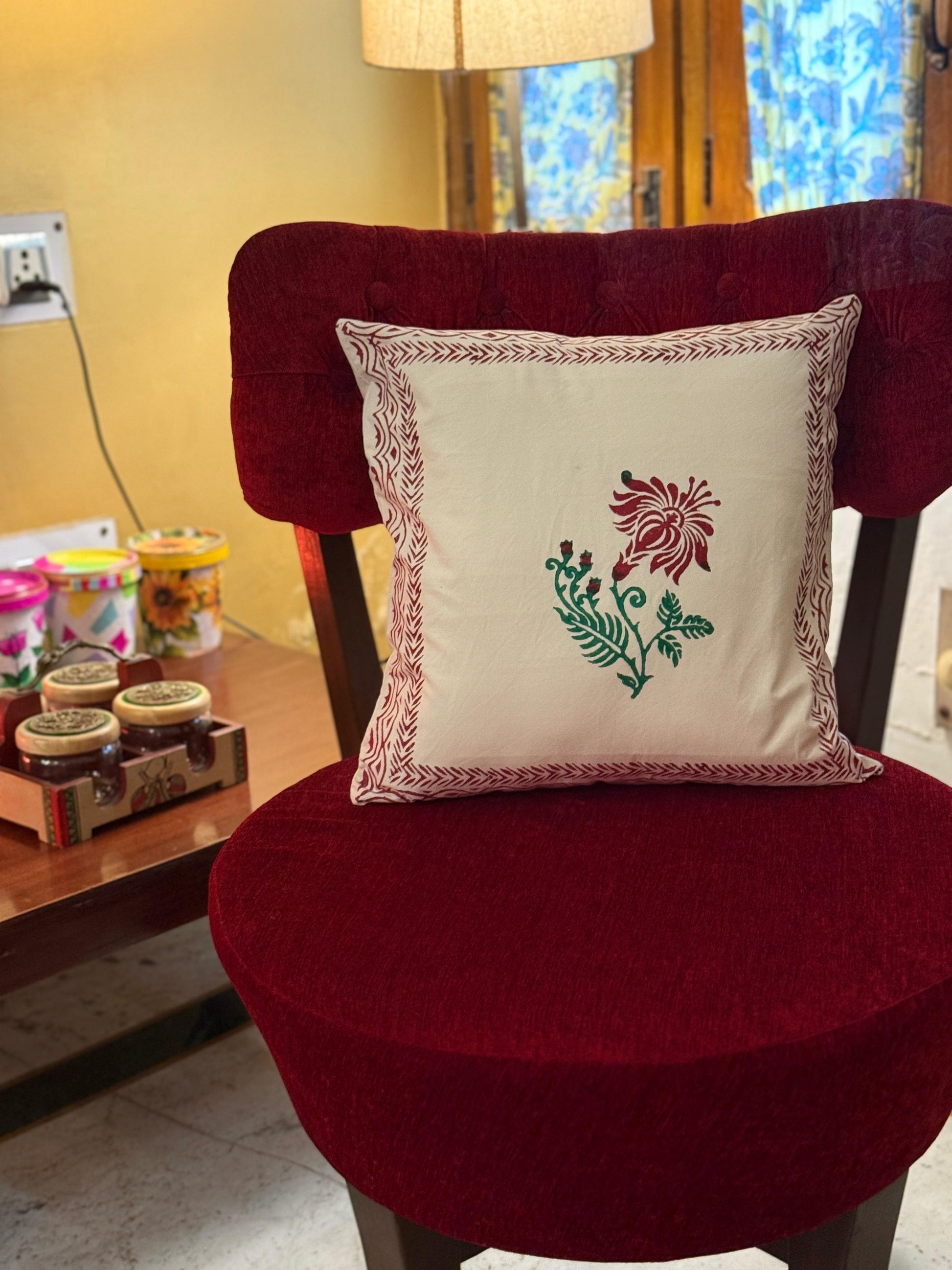 Infuse your space with the timeless beauty of hand-block printed hibiscus blooms in rich maroon and green. Gudhal celebrates traditional floral elegance while offering everyday ease.