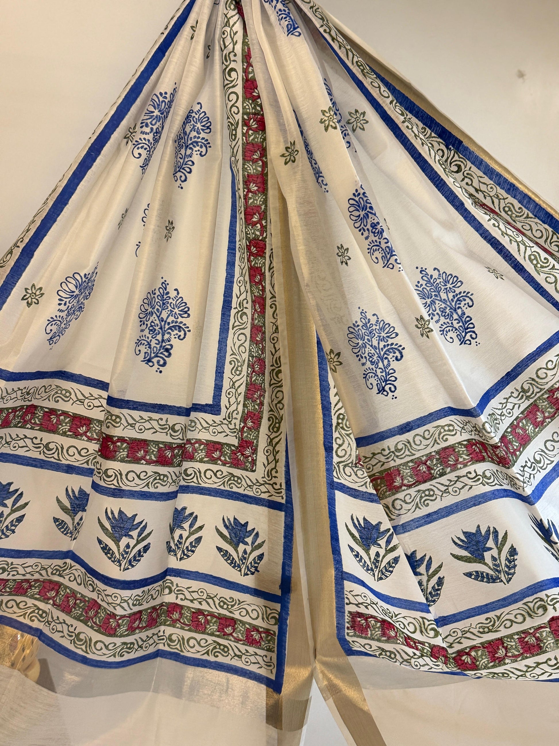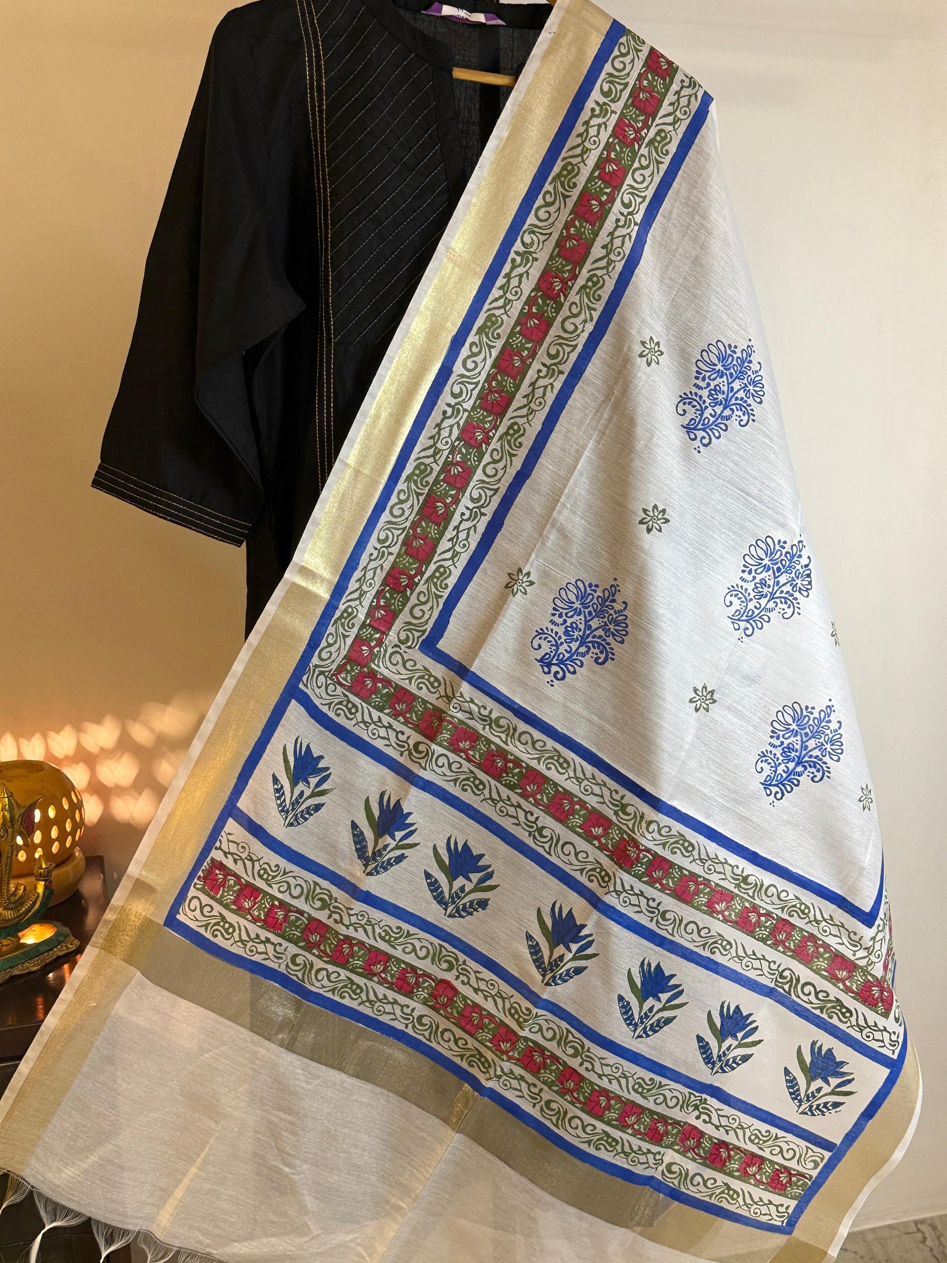 🌿✨ Step into the garden of grace with Gulbahar—our newest white Chanderi silk dupatta (48"x92" / 86x234 cm), a canvas of calm adorned with hand-block printed floral motifs in blue, dark pink, and green.
