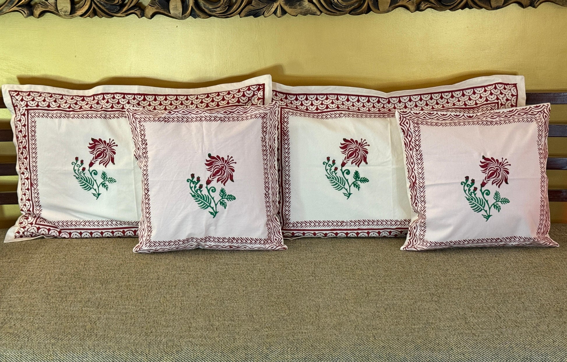 Hibiscus is the Ivory Cotton Pillow Cover Set featuring vibrant maroon and green hibiscus hand-block prints, bringing a touch of nature’s elegance to your home. Each set includes two covers (king size-30"x20"/76x51 cm) with unique handmade variations, ensuring no two pieces are alike. Crafted from soft, durable cotton, they’re machine-washable for easy care. Perfect for adding artisanal charm to your living room or bedroom, where tradition meets everyday comfort.