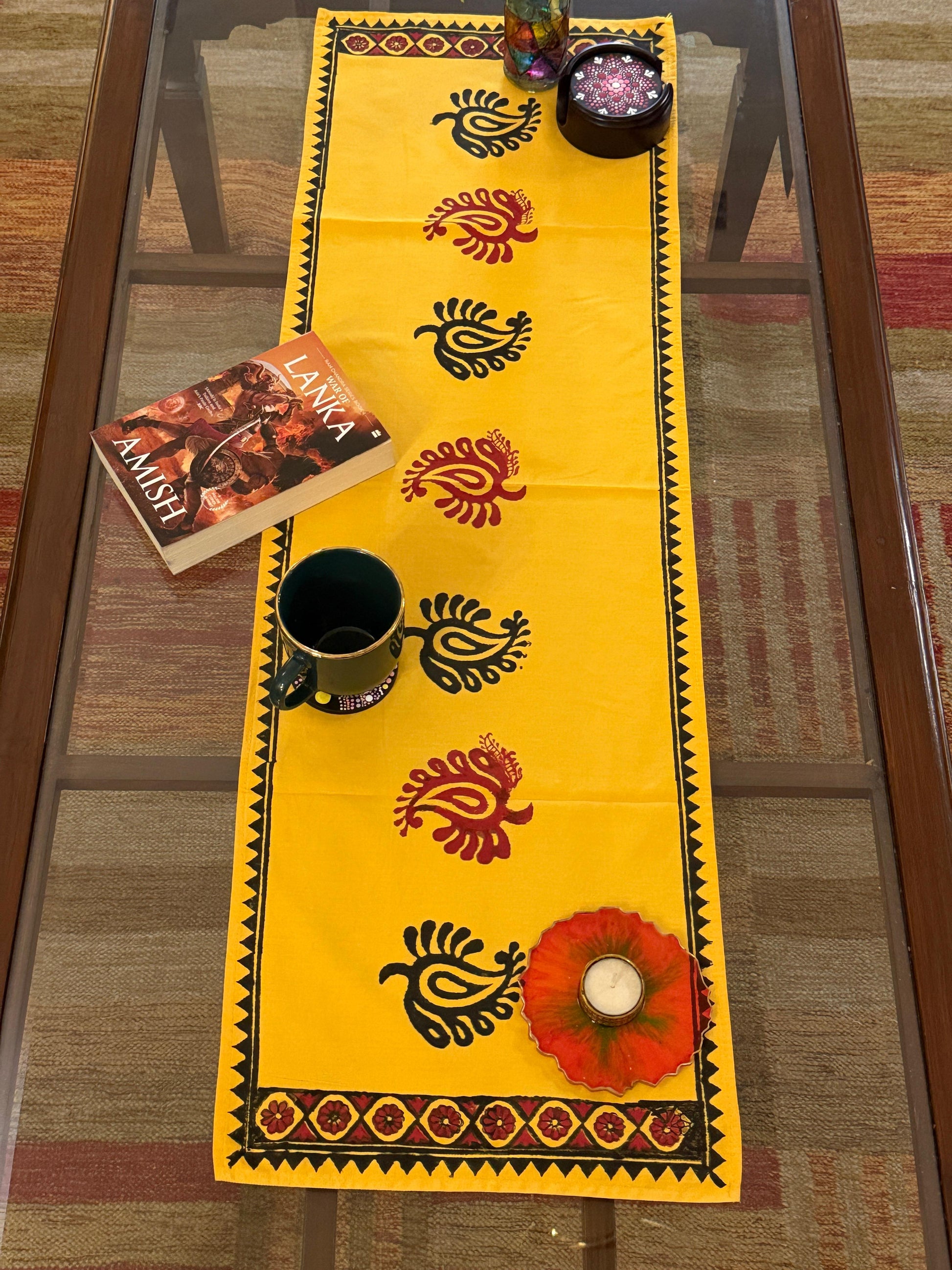 Add a bold burst of warmth with Kesari, a handcrafted yellow coffee table runner adorned with striking red and black hand block-printed accents. Measuring 13" x 42", this one-of-a-kind piece blends traditional charm with modern vibrance. Each runner carries unique handmade variations, celebrating the beauty of imperfection. Machine washable and effortlessly stylish, Kesari brings artisanal flair to everyday living perfect for elevating your space with colour, culture, and craftsmanship.