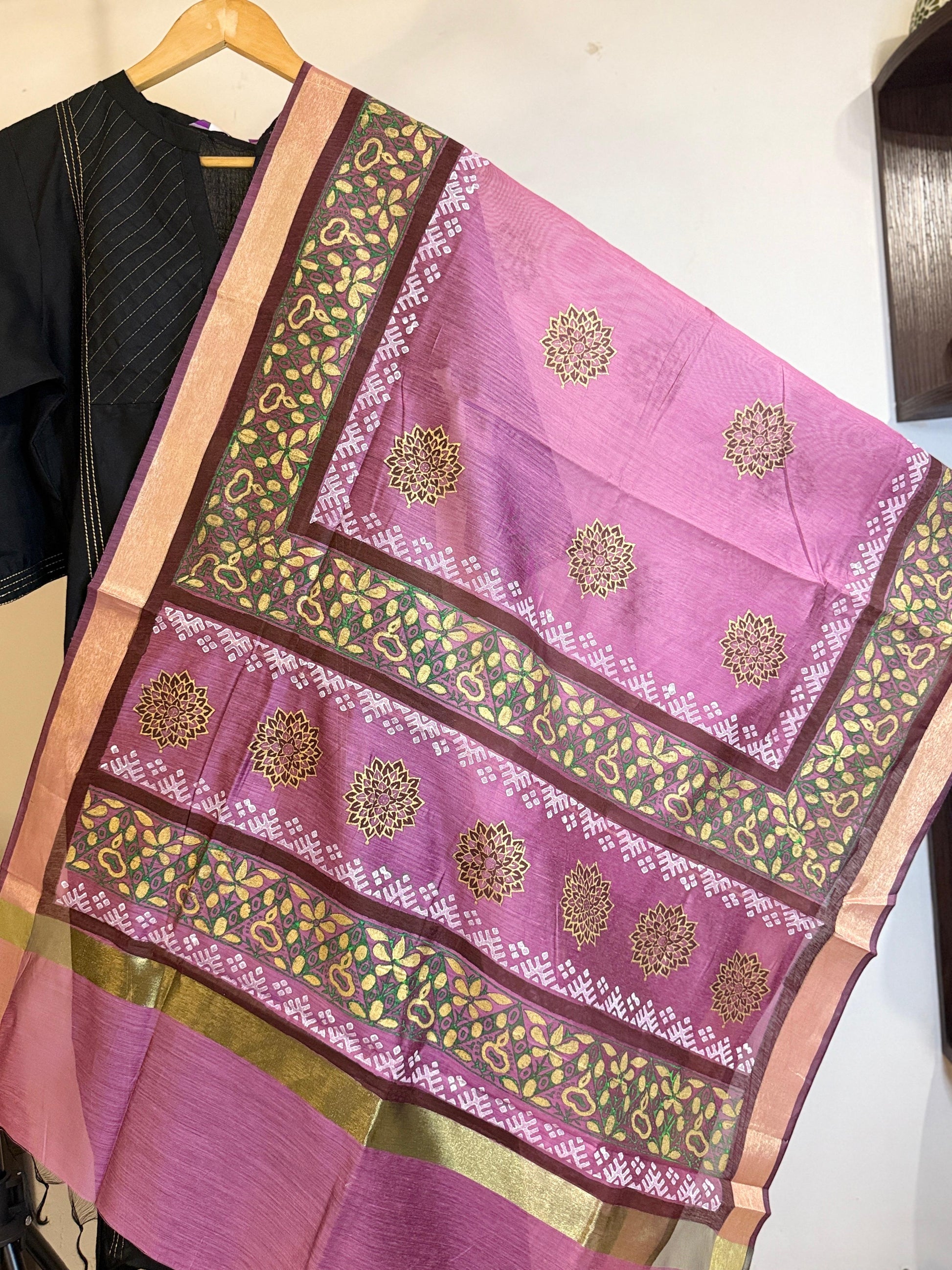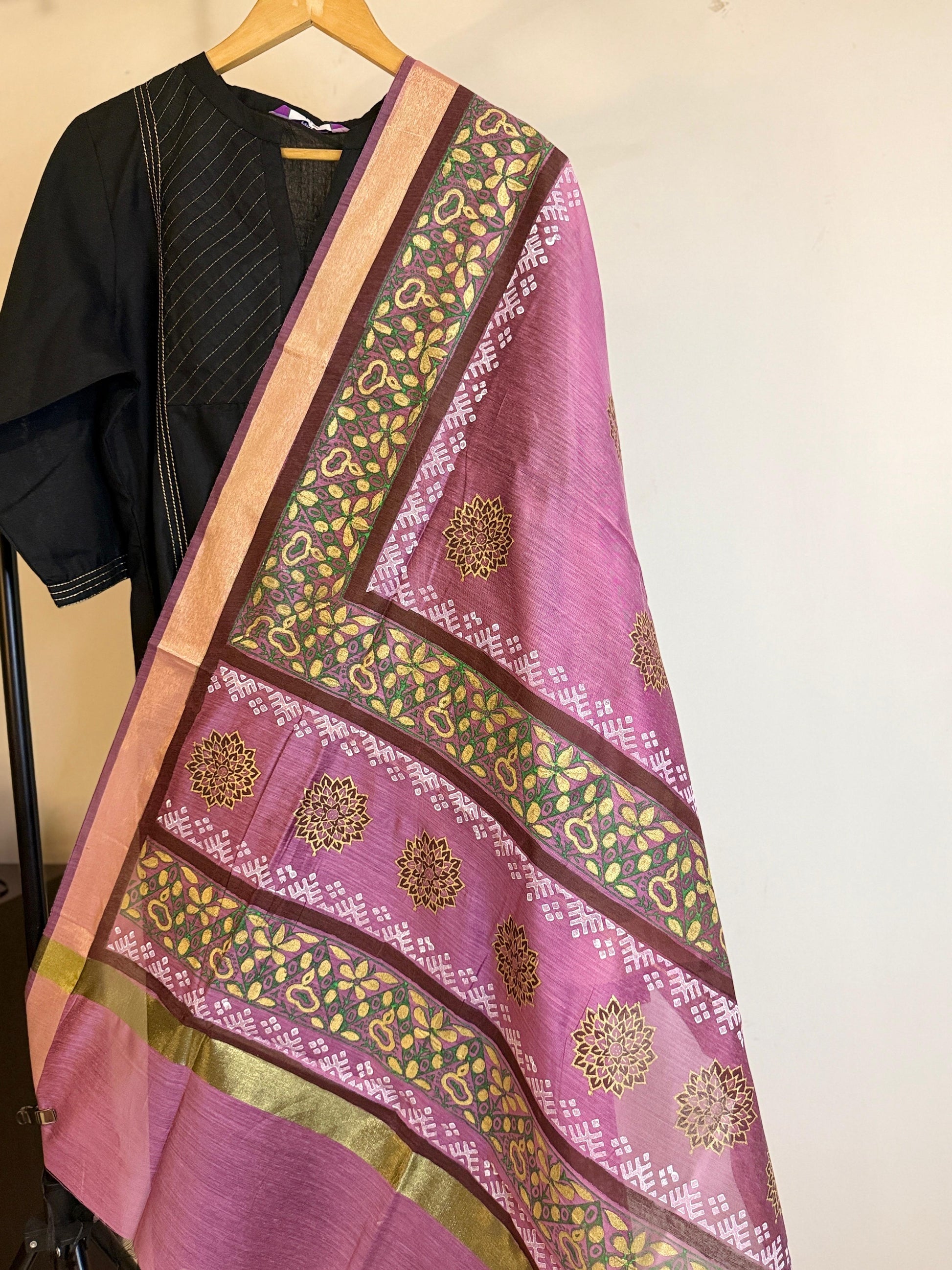 Soft as a sigh, radiant as tradition—Lavanya is a mauve Chanderi silk dupatta that speaks the language of grace. Adorned with delicate motifs in wine, white, and golden hues, it evokes the beauty of twilight rituals and festive whispers. Each pattern is hand block printed using the traditional wooden technique, a craft lovingly preserved by women artisans.