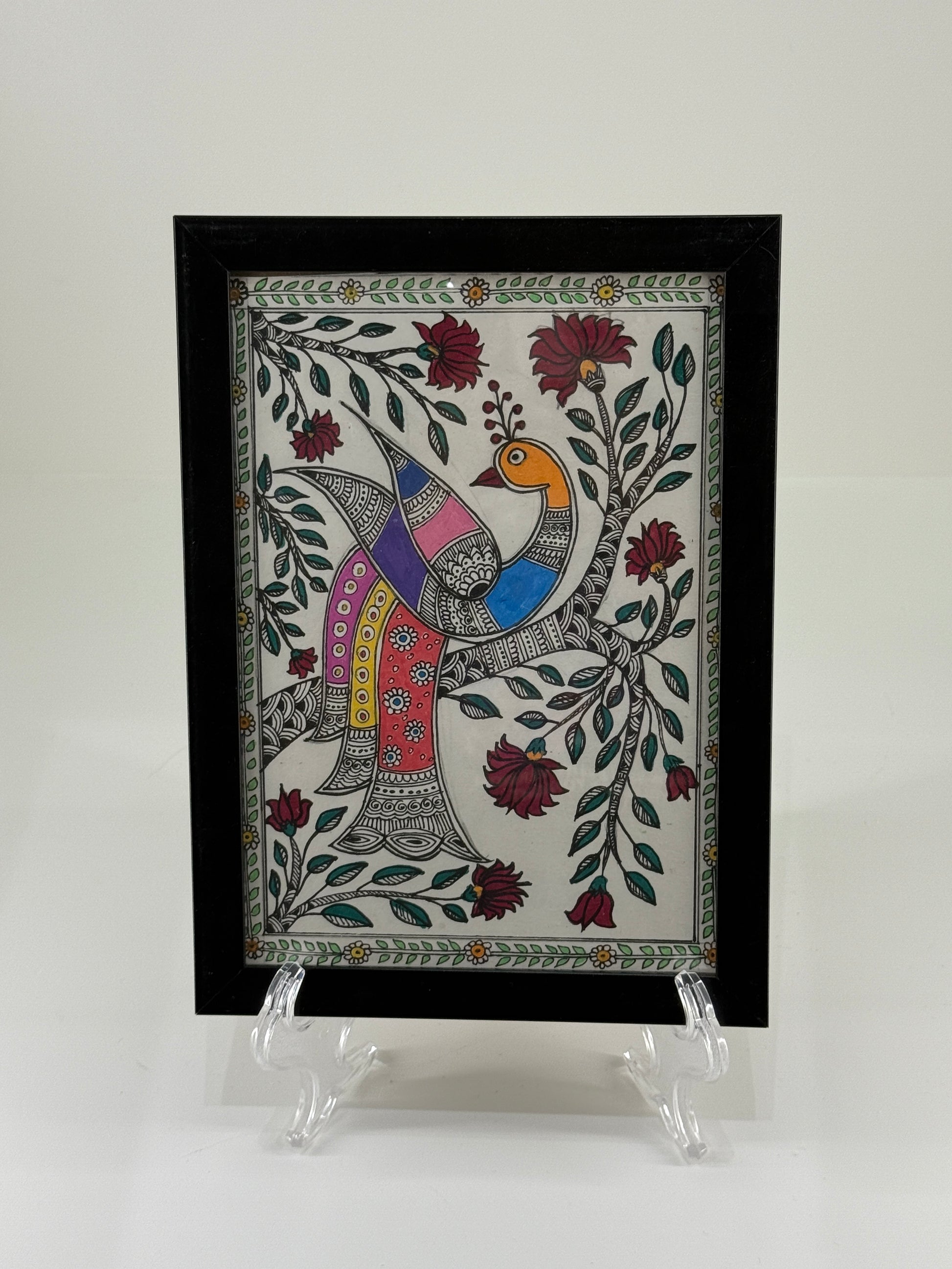 A5-sized Madhubani artwork featuring a single peacock perched gracefully on a tree branch. Framed in a sleek black plastic frame, this piece is lightweight and effortlessly aesthetic—ideal for adding a touch of folk charm to any wall.
