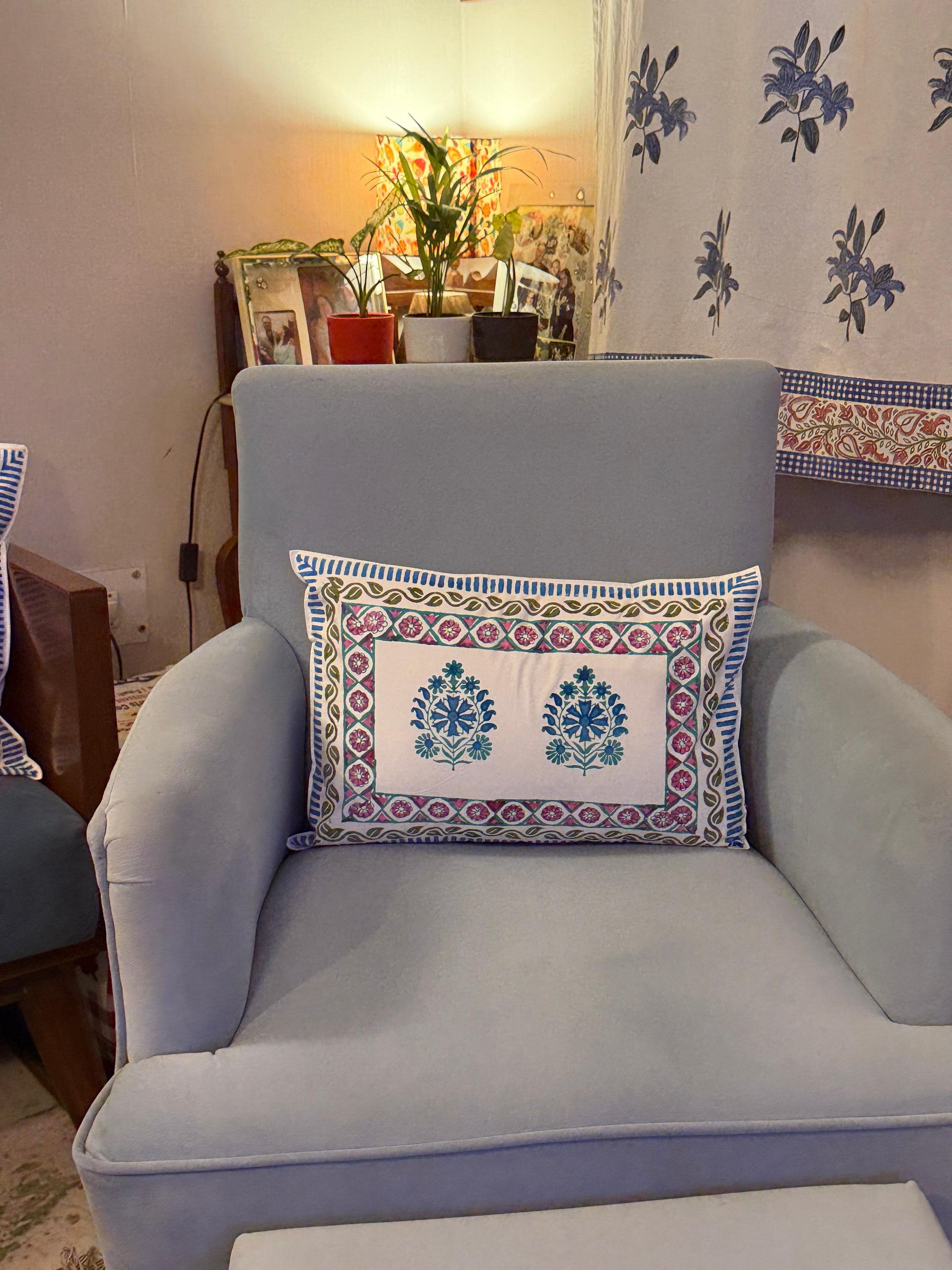 Crafted in 100% cotton with a white base, each cover features delicate hand block motifs in turquoise blue, light pink, and green, evoking the freshness of spring and the stillness of quiet mornings. Whether placed in your drawing room or tucked into a cozy corner, Sukoon creates a peaceful and elegant look that soothes the senses.