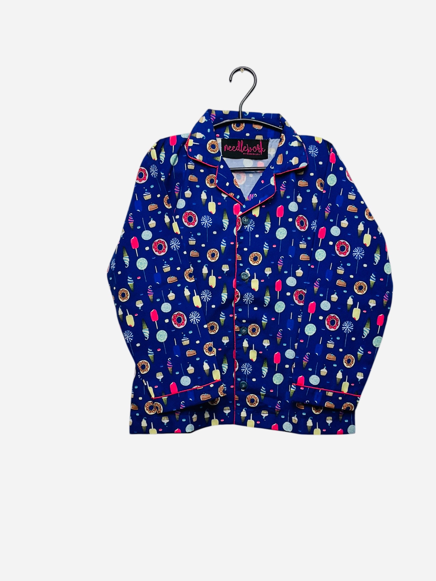 The Sweet Treats Night suit is a dream come true for every little dessert lover! Featuring a dark blue base sprinkled with colorful donuts, popsicles, and candies β itβs as fun as a candy shop! Made with soft, breathable cotton, it keeps your child cozy all night long.
