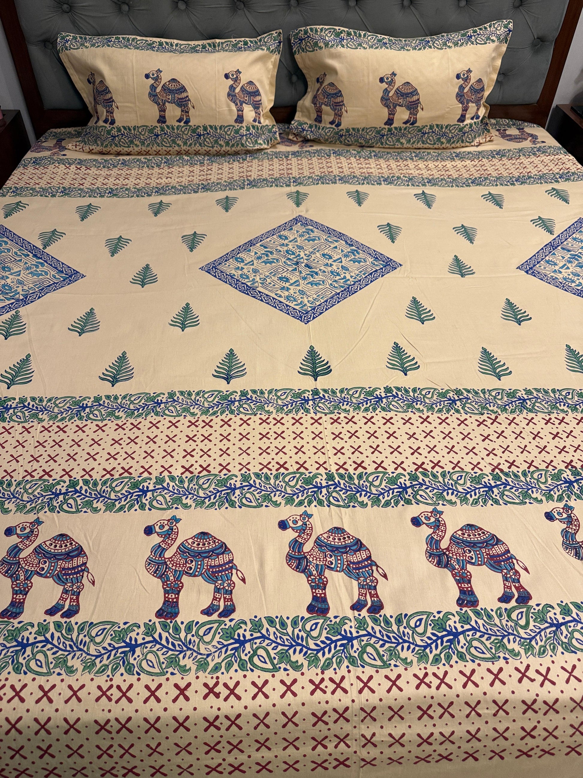 Set against a warm beige canvas, this bedsheet features hand block printed camel motifs in elegant shades of blue and red, capturing the essence of nomadic grace and cultural richness.