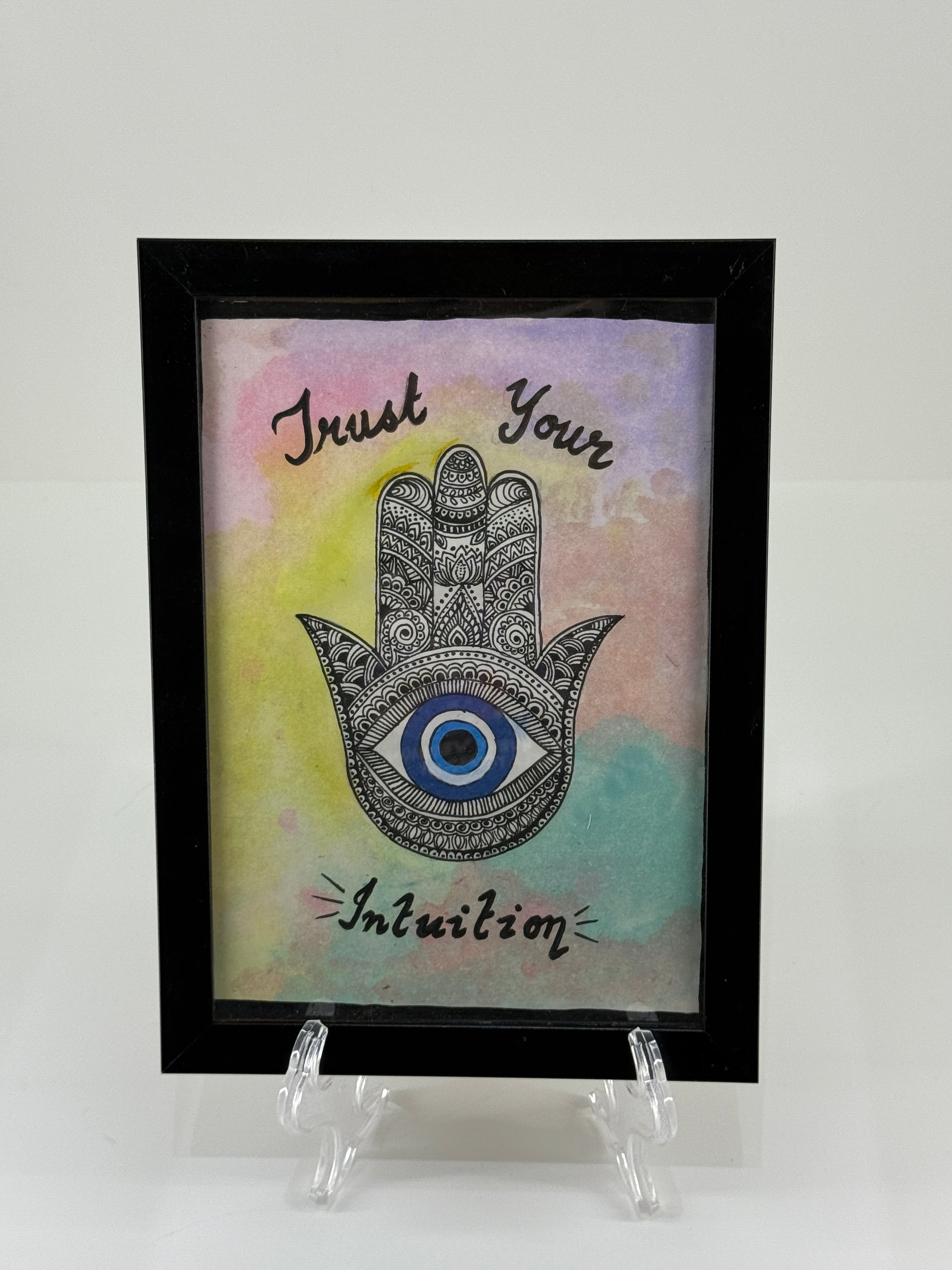 Rooted in ancient symbolism, the Hamsa hand represents divine protection, while the mandala patterns evoke balance and mindfulness. The central evil eye wards off negativity, and the message “Trust Your Intuition” invites calm, clarity, and inner strength.